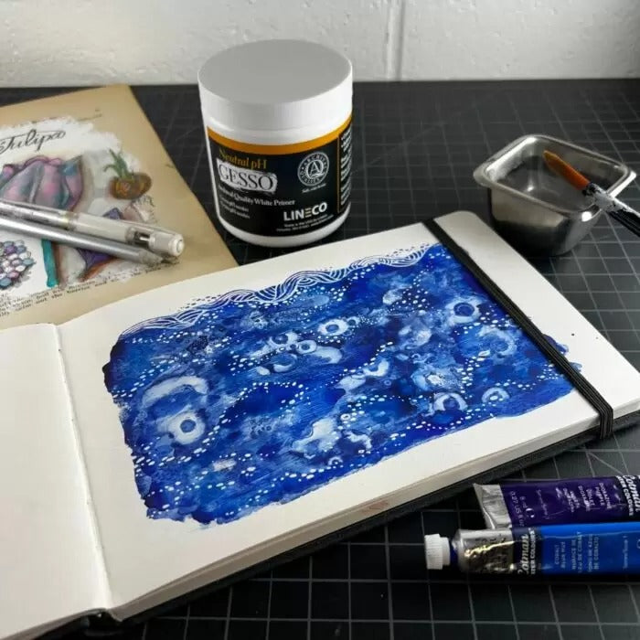 We has created a new neutral pH Gesso Primer which is buffered with calcium carbonate to help neutralize acids. Artists can help protect their work from the off gassing of wooden panels and stretcher bars, as well as acids found in the environment. In addition, this white gesso provides a nice textured finish to work on. Helps keep colors bold and vibrant. Price per 238 ml (8 oz) jar.